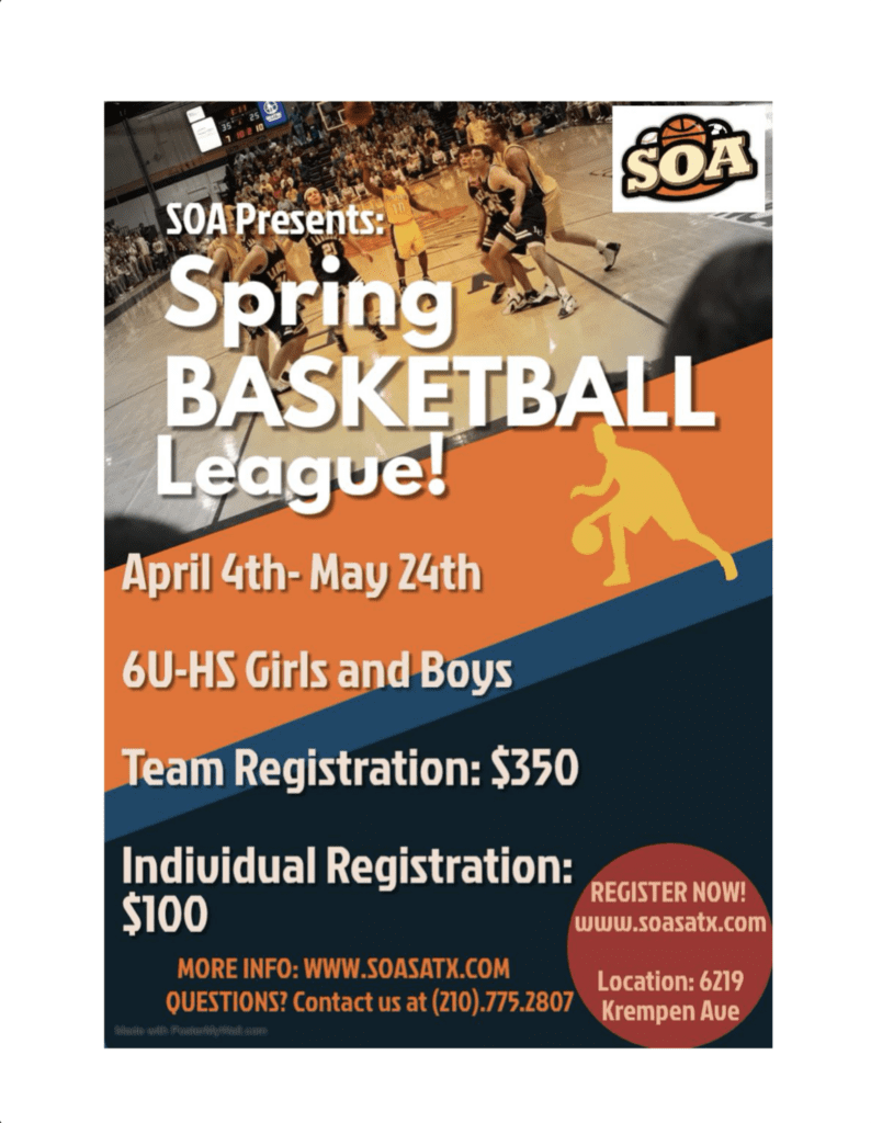 League Enroll in Basketball League San Antonio’s Premier Youth Basketball League Stay Updated on Upcoming Leagues Click the link to enroll: Standard Of Athletics (teamsideline.com) Parent Packet 2026 Coaches Packet 2026 SOA Registration Form